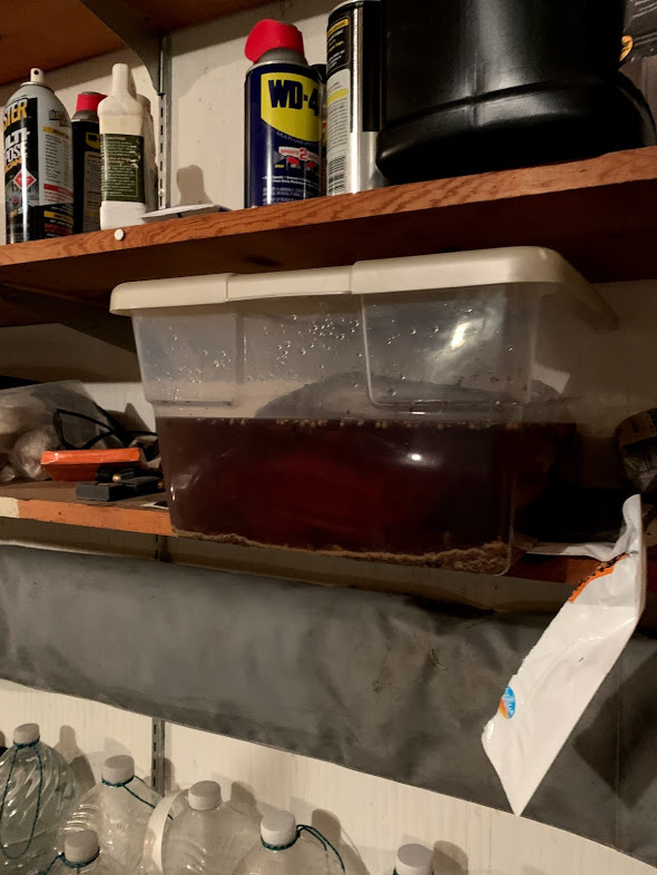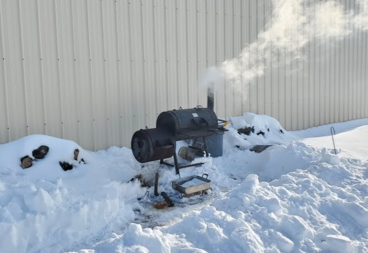 The next step is to desalinate the meat by letting it soak in plain water for 8 hours. Ours rode out the desalination in the back of the truck on the way back to the smoker in Colorado. (I should probably note that it is winter here in KS and CO, making it possible to replace the fridge with the garage and back of the truck. Not recommended in other seasons or climates!)