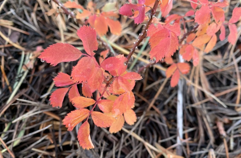 Dampened pine scents the spent wild rose to ruddy red—